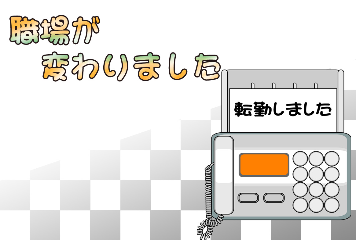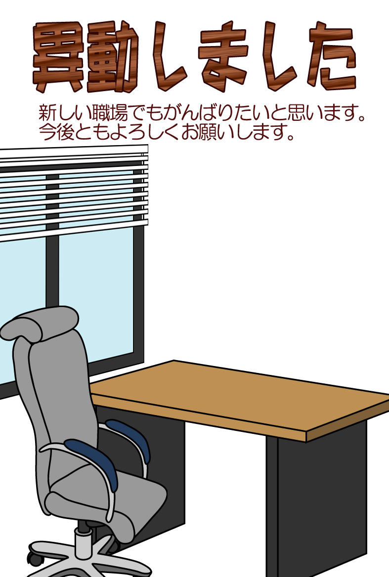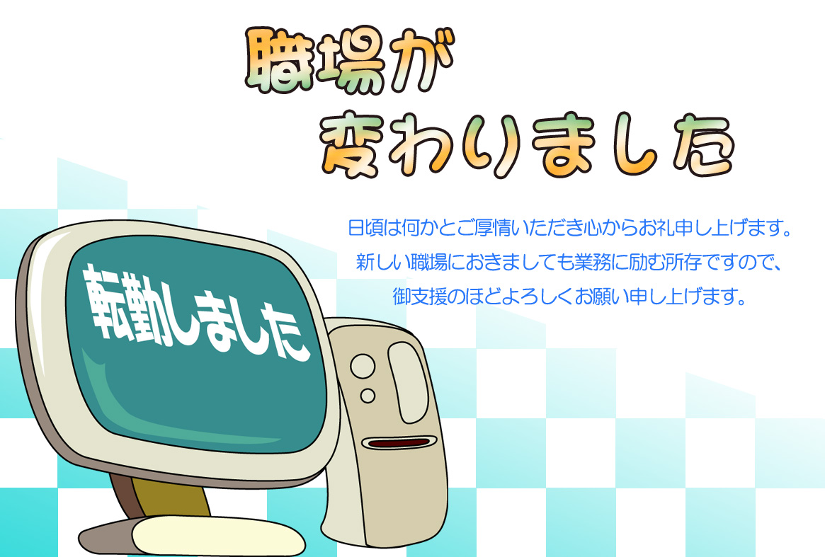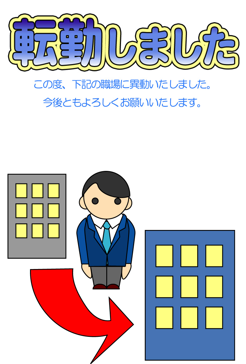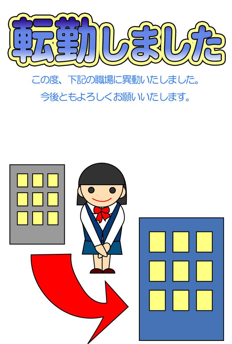 そのまま印刷して即転勤移動のお知らせが出来上がる異動通知のページです。新住所は画像の上に重ねるか、ハガキの宛名面にご記入下さい。