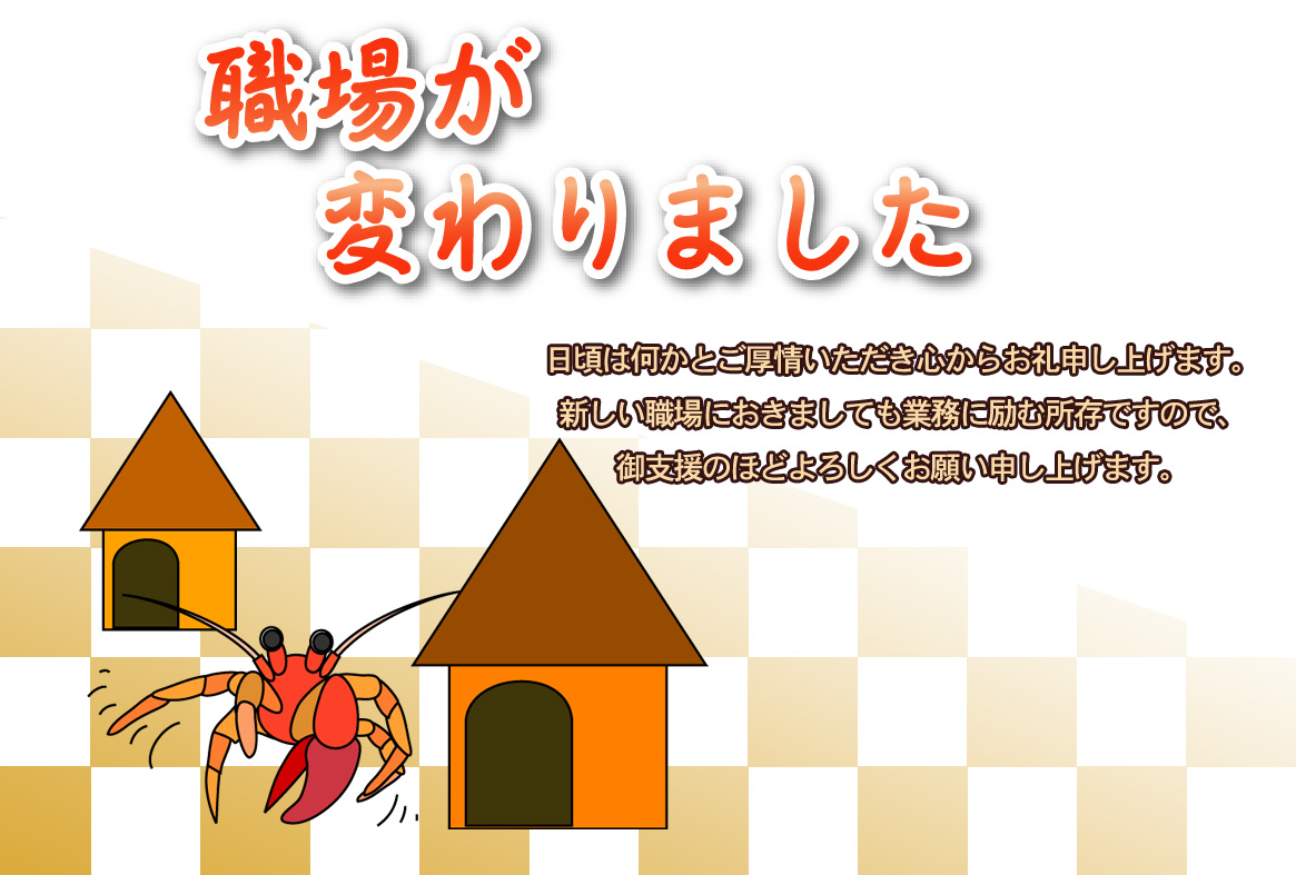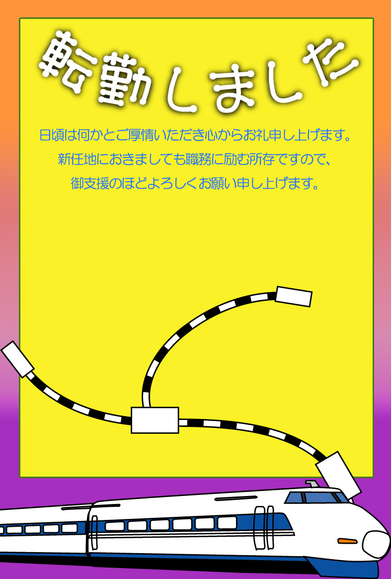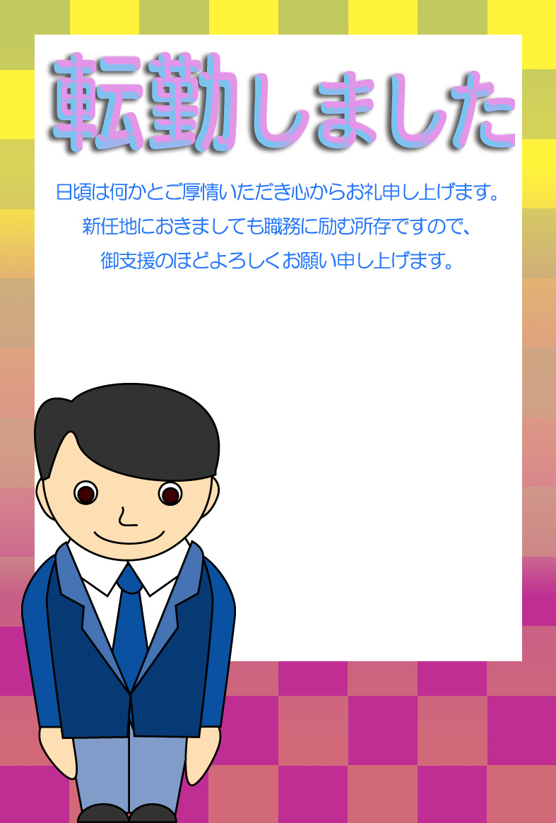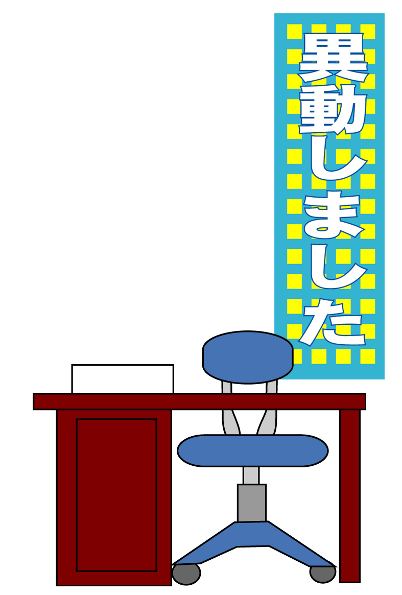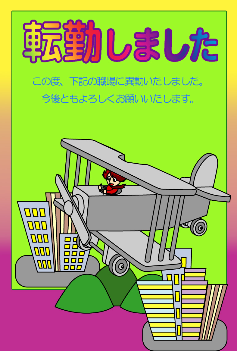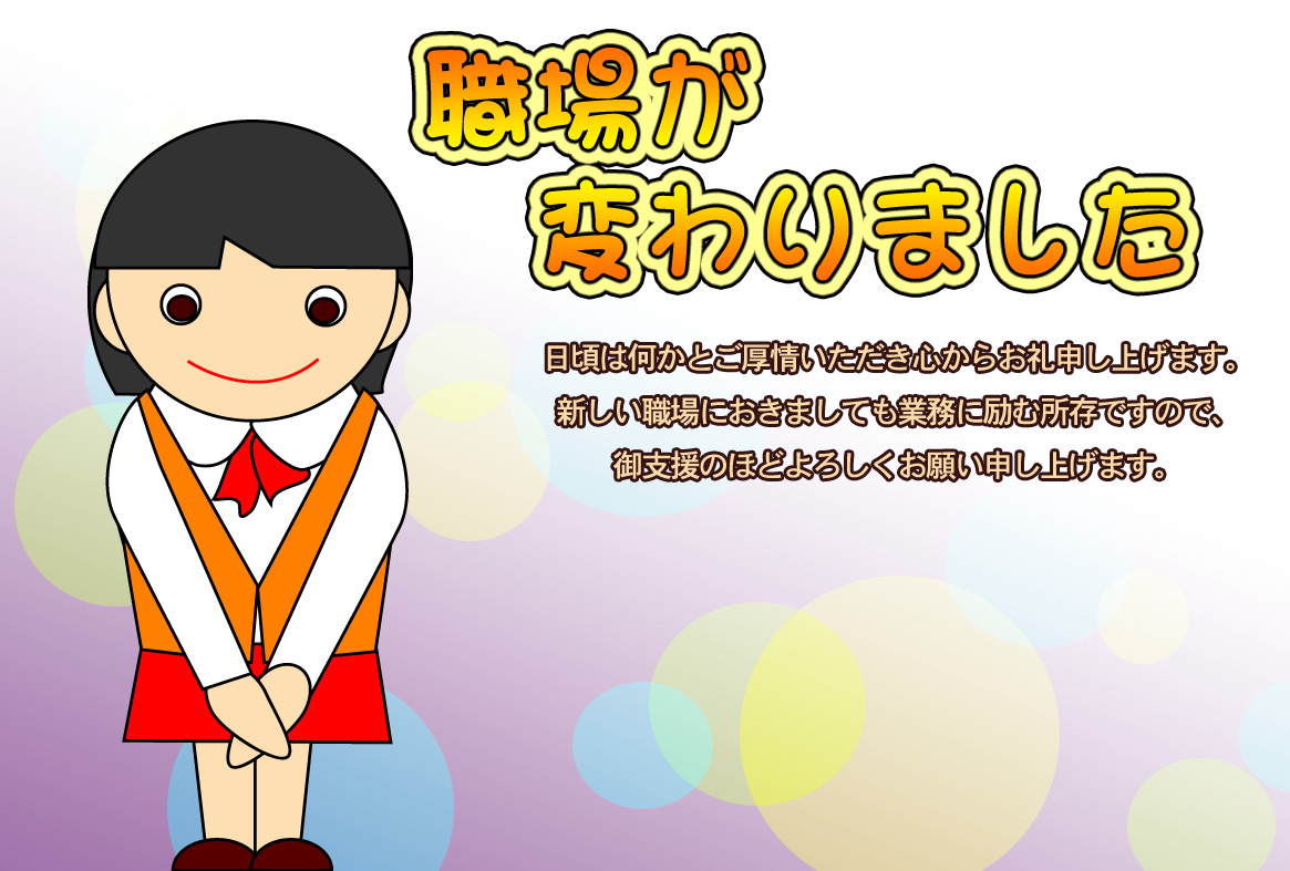 そのまま印刷して即転勤移動のお知らせが出来上がる異動通知のページです。新住所は画像の上に重ねるか、ハガキの宛名面にご記入下さい。