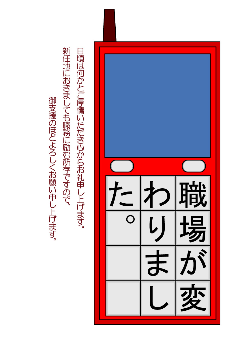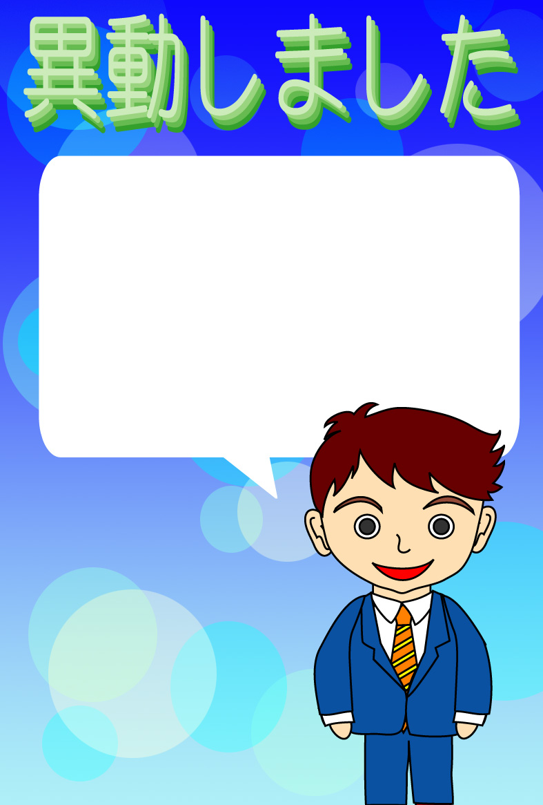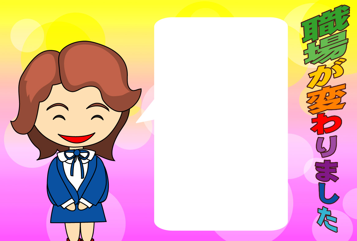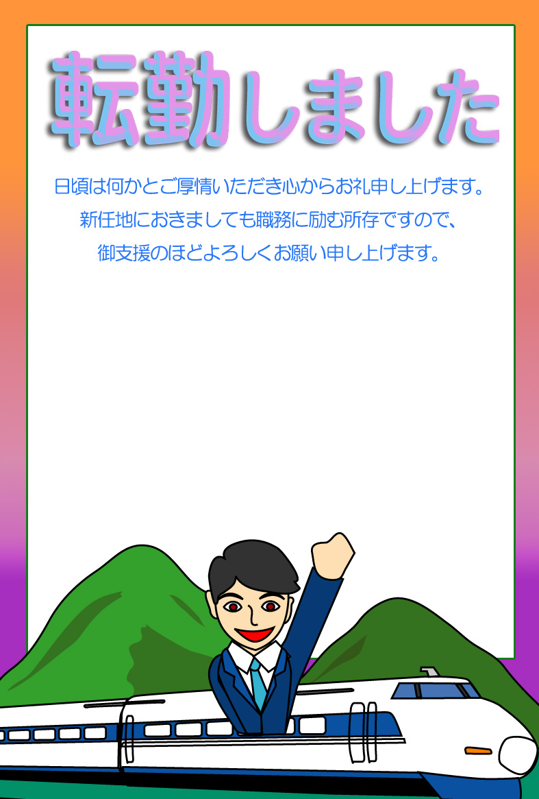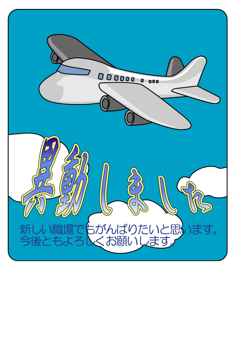そのまま印刷して即転勤移動のお知らせが出来上がる異動通知のページです。新住所は画像の上に重ねるか、ハガキの宛名面にご記入下さい。