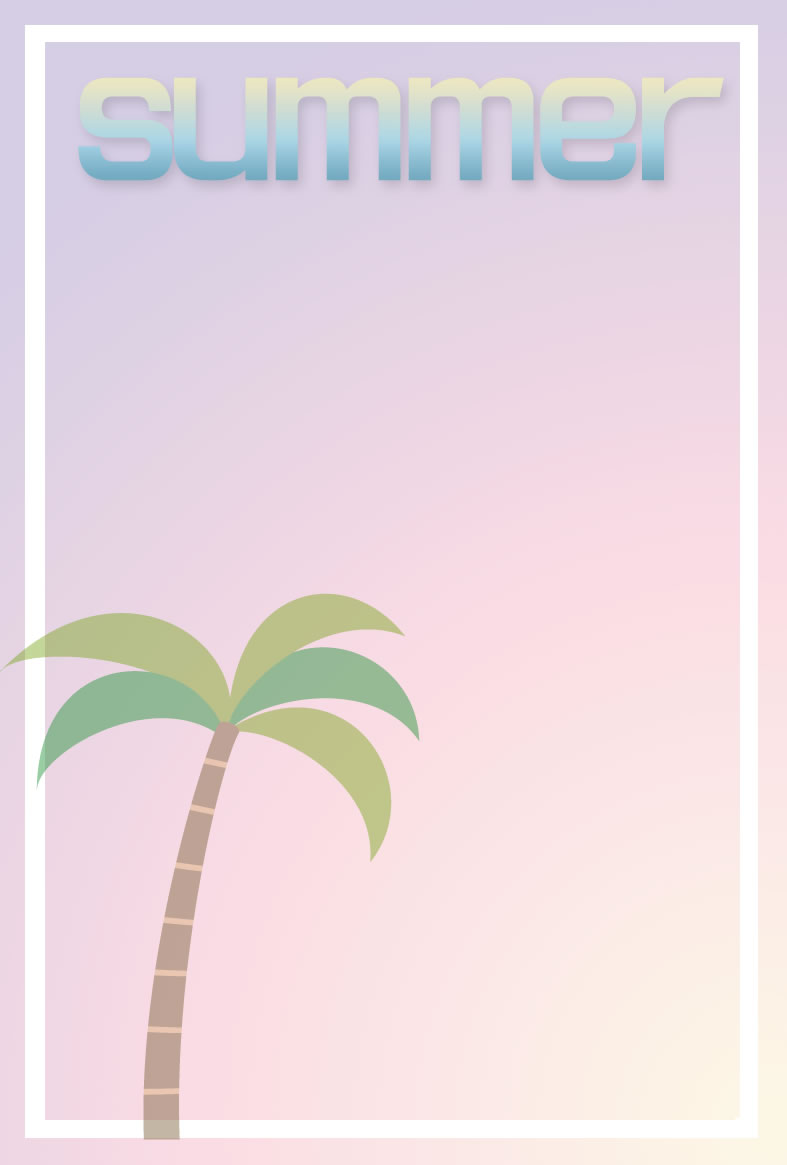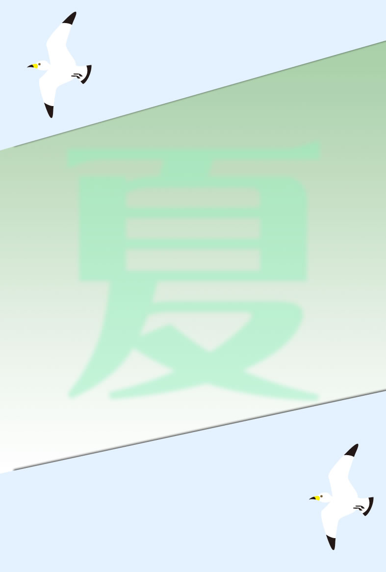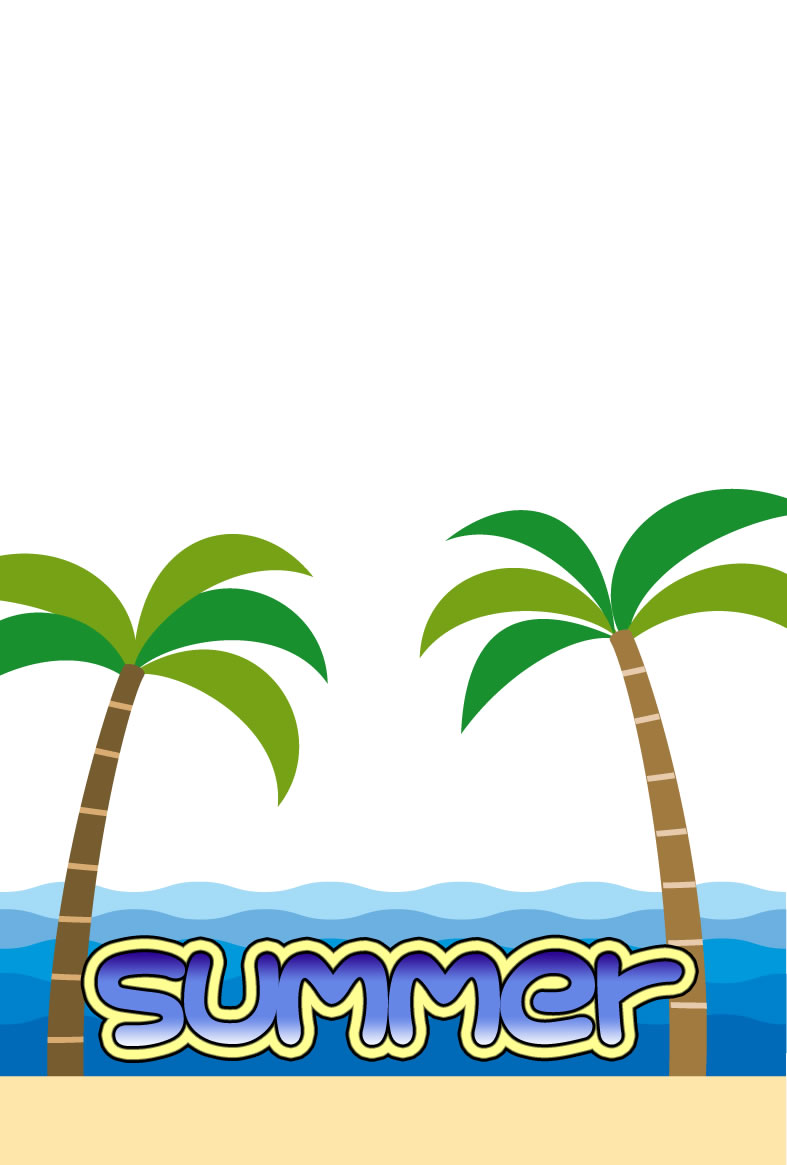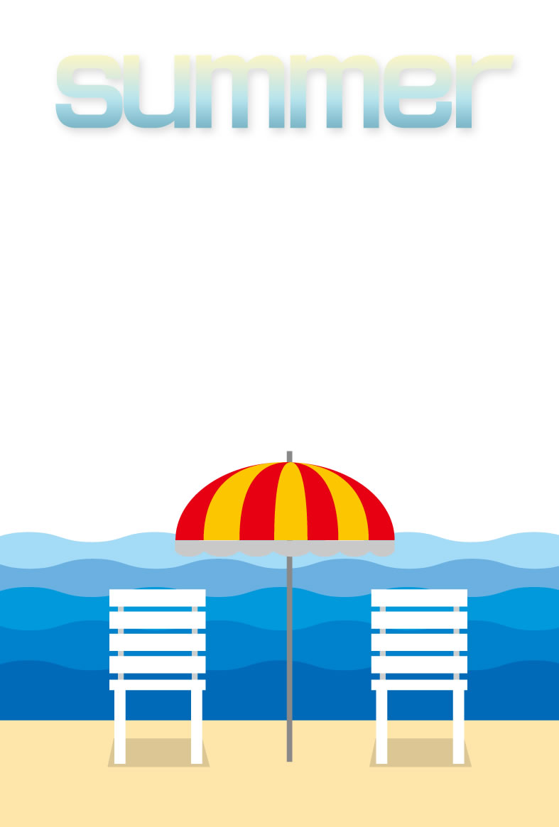 ヤシの木やパラソル、カモメやペンギンなどイラストをあしらった暑中見舞いハガキの縦書きデザインを無料提供しています。あいさつ文などを入れて印刷するだけで暑中見舞いが完成する素材です。