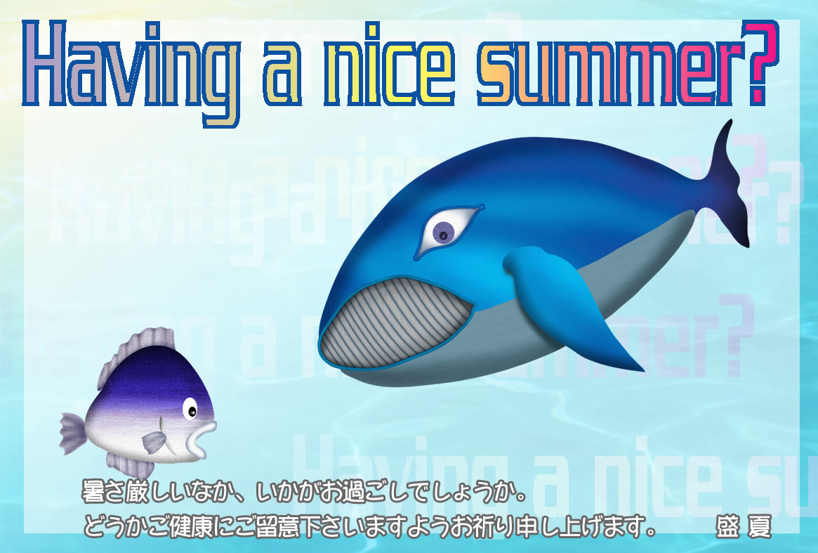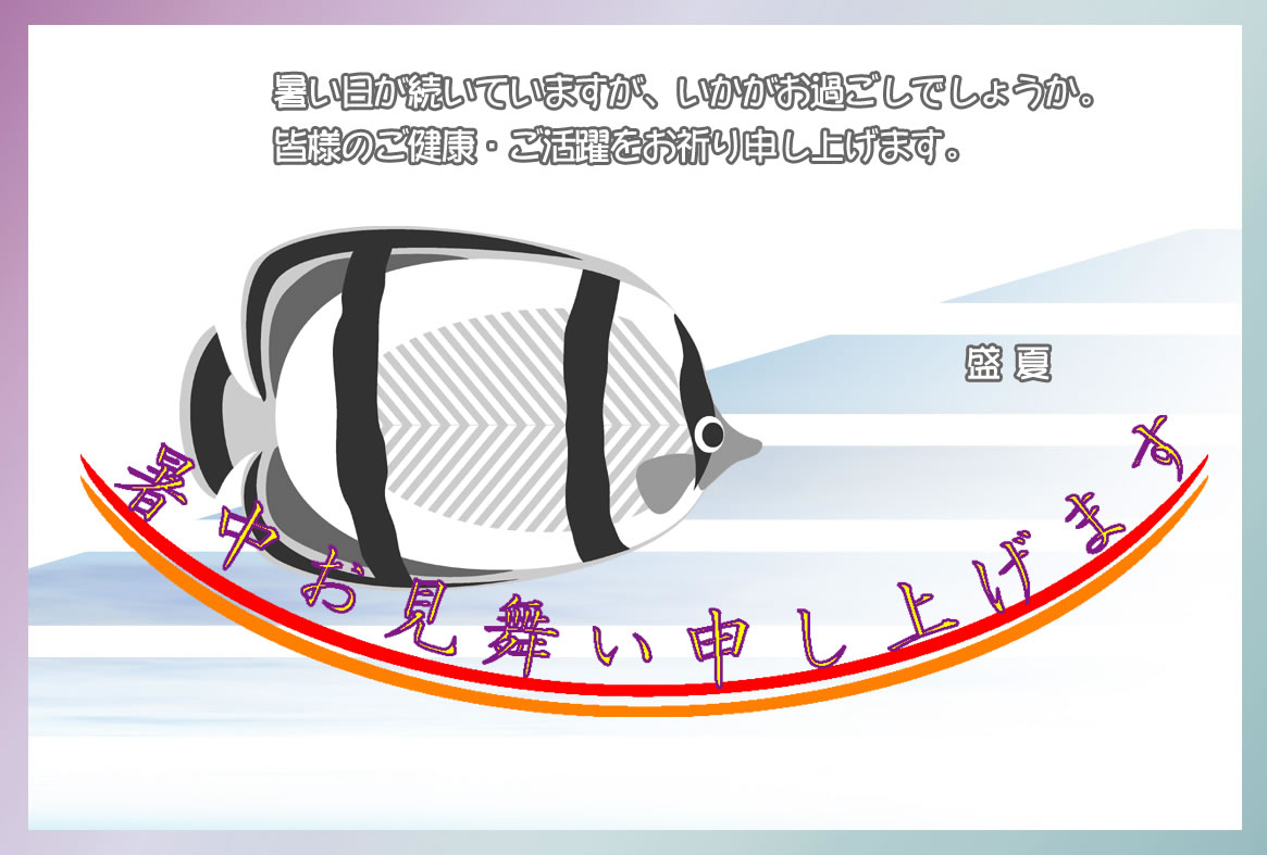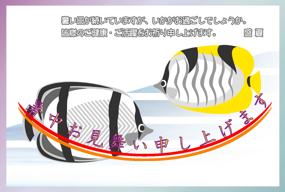 熱帯魚やクジラ、ヨットや汽船などのイラストをあしらった暑中見舞いハガキの横書きデザインを無料提供しています。あいさつ文などを入れて印刷するだけで暑中見舞いが完成する素材です。