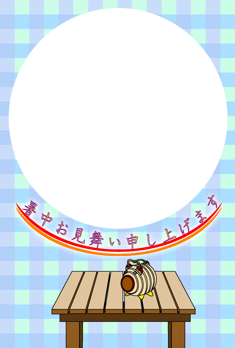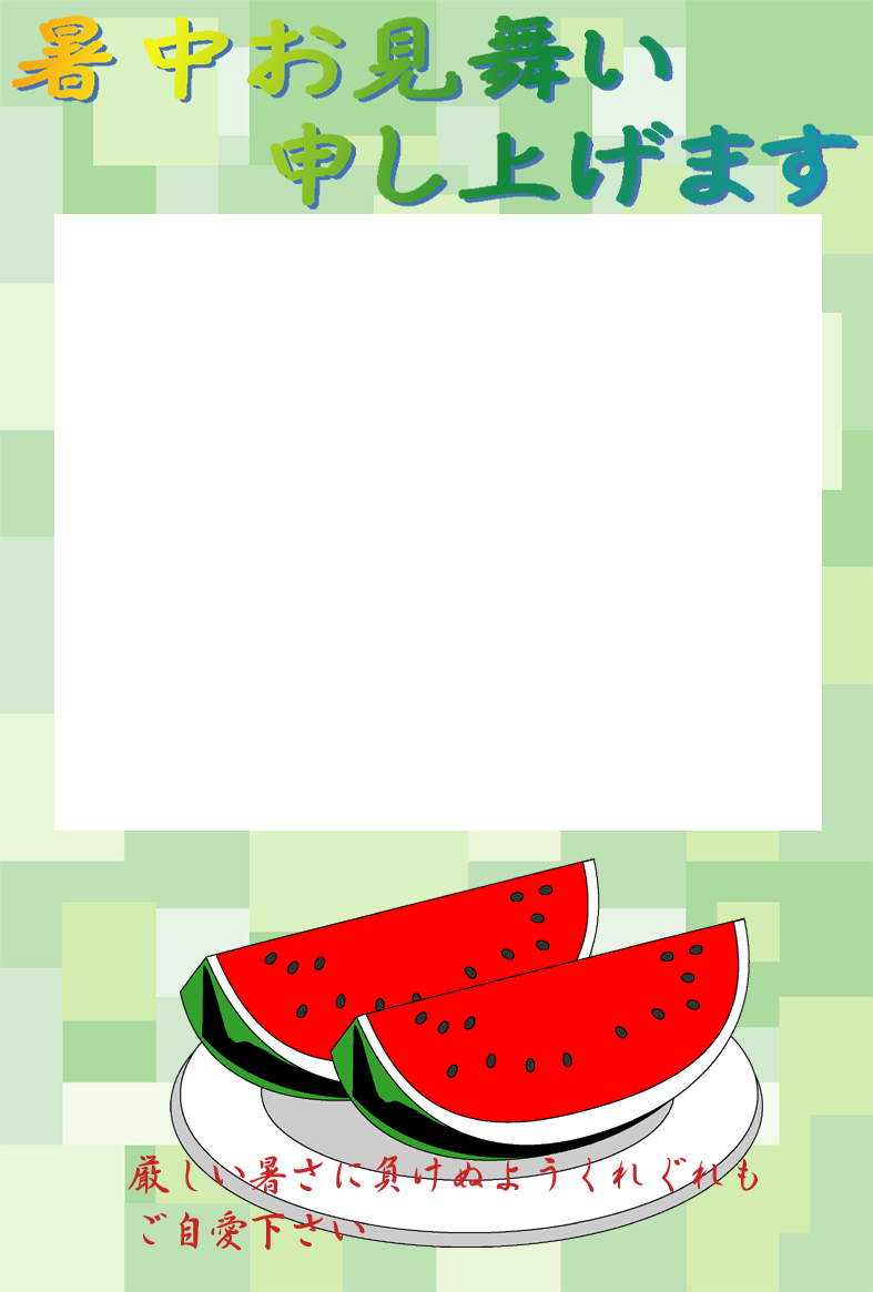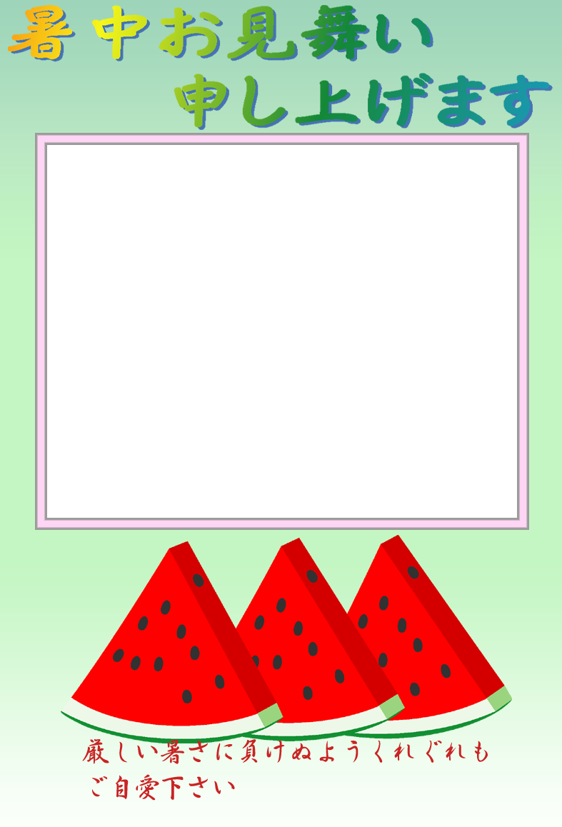 スイカやアイス、縁台や朝顔などのイラストをあしらった暑中見舞いハガキの縦書き写真フレームを無料提供しています。写真と組み合わせて印刷するだけで暑中見舞いが完成する素材です。