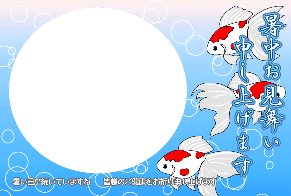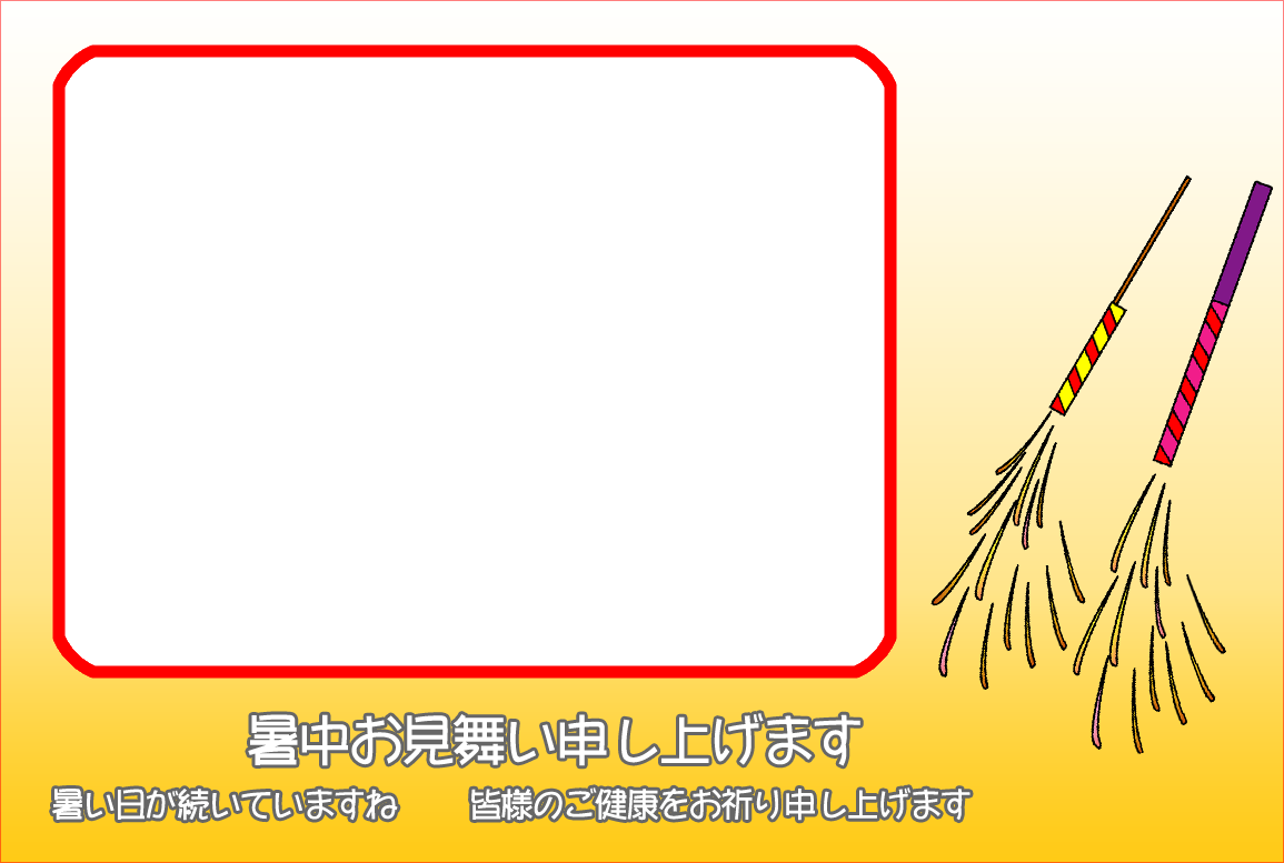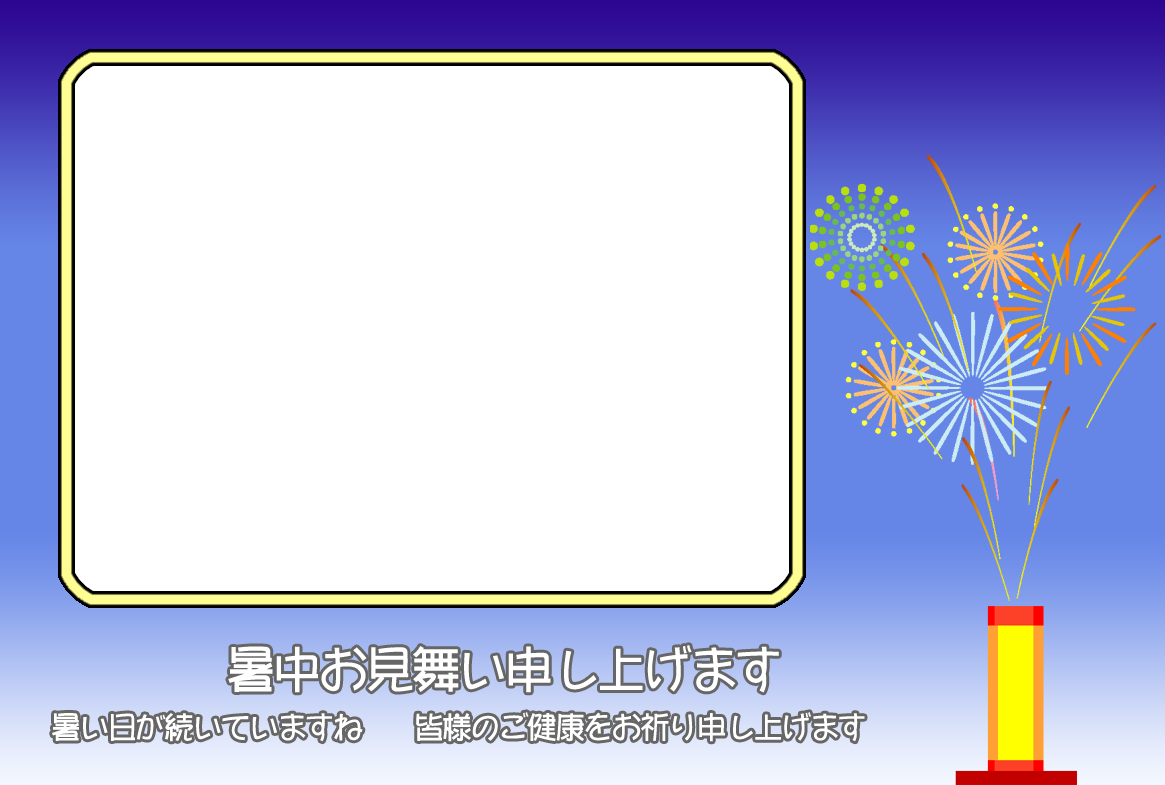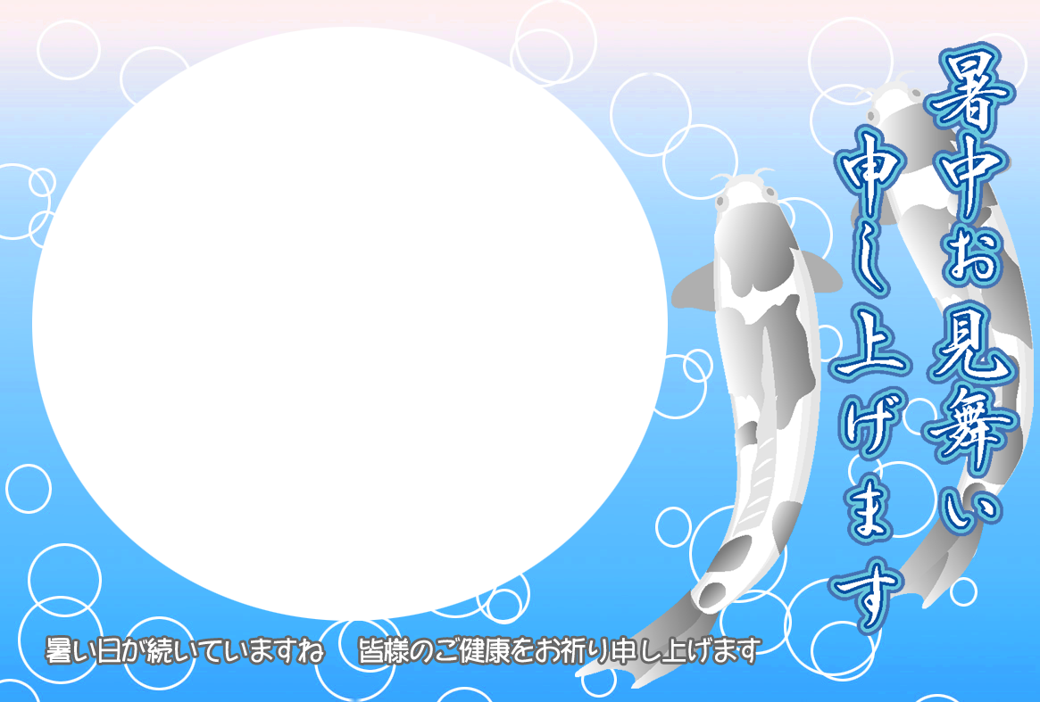 ひまわり花火、錦鯉や金魚などのイラストをあしらった暑中見舞いハガキの横書き写真フレームを無料提供しています。写真と組み合わせて印刷するだけで暑中見舞いが完成する素材です。