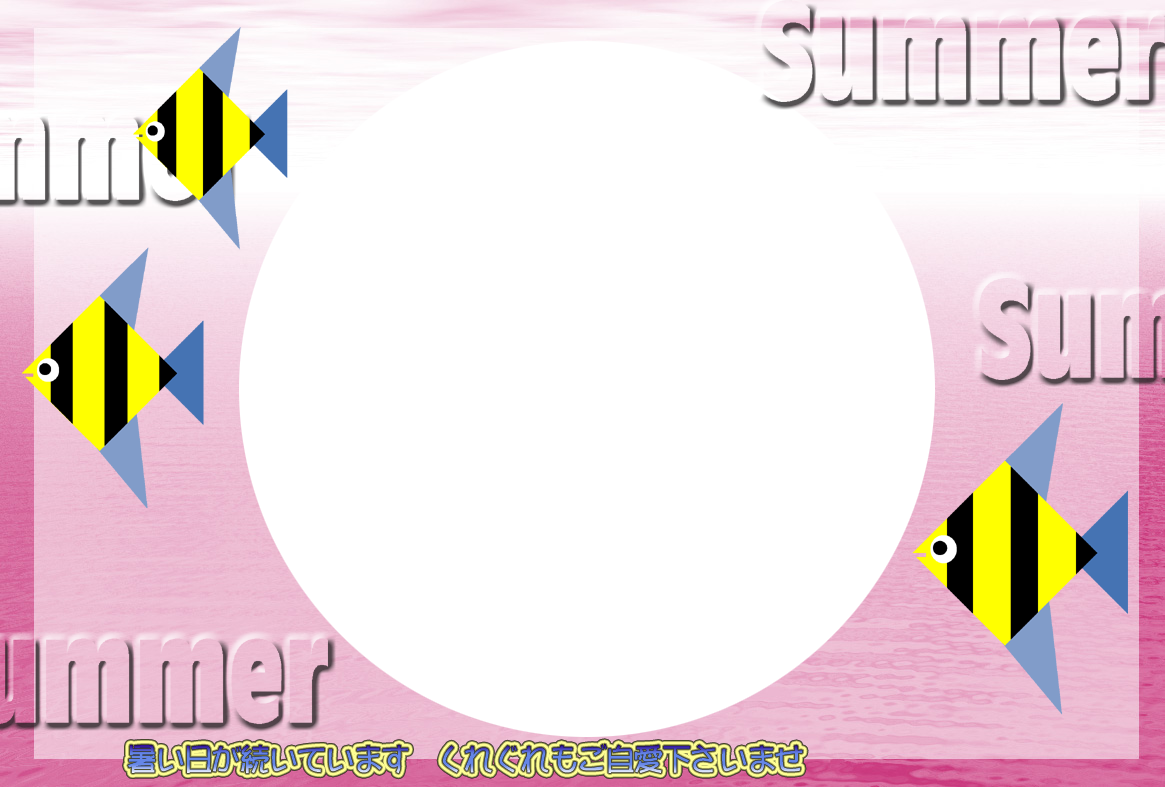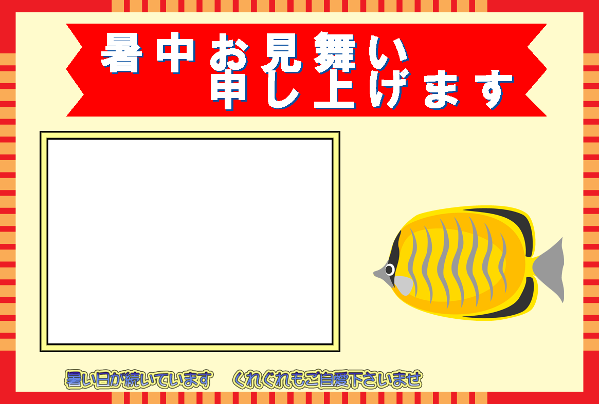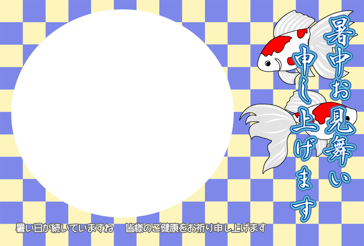 ひまわり花火、錦鯉や金魚などのイラストをあしらった暑中見舞いハガキの横書き写真フレームを無料提供しています。写真と組み合わせて印刷するだけで暑中見舞いが完成する素材です。