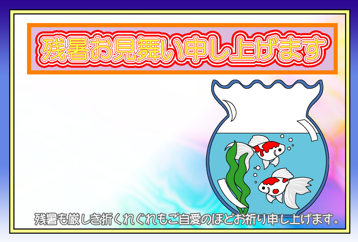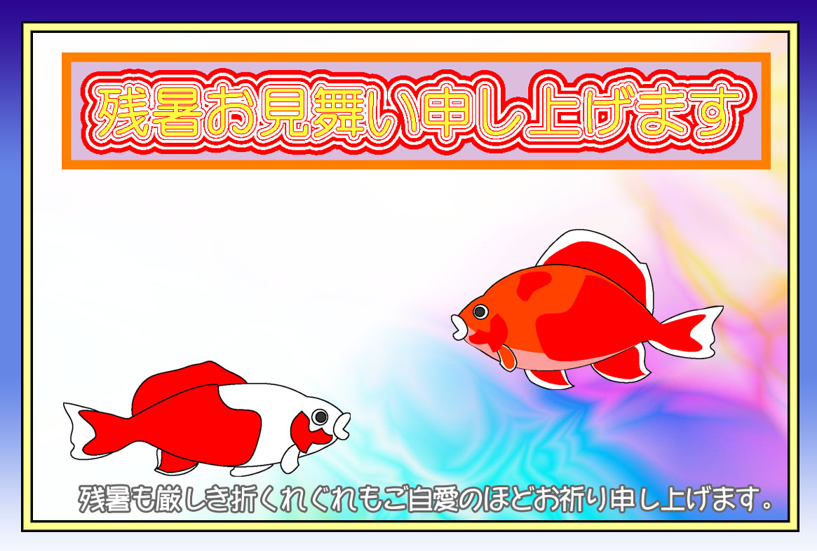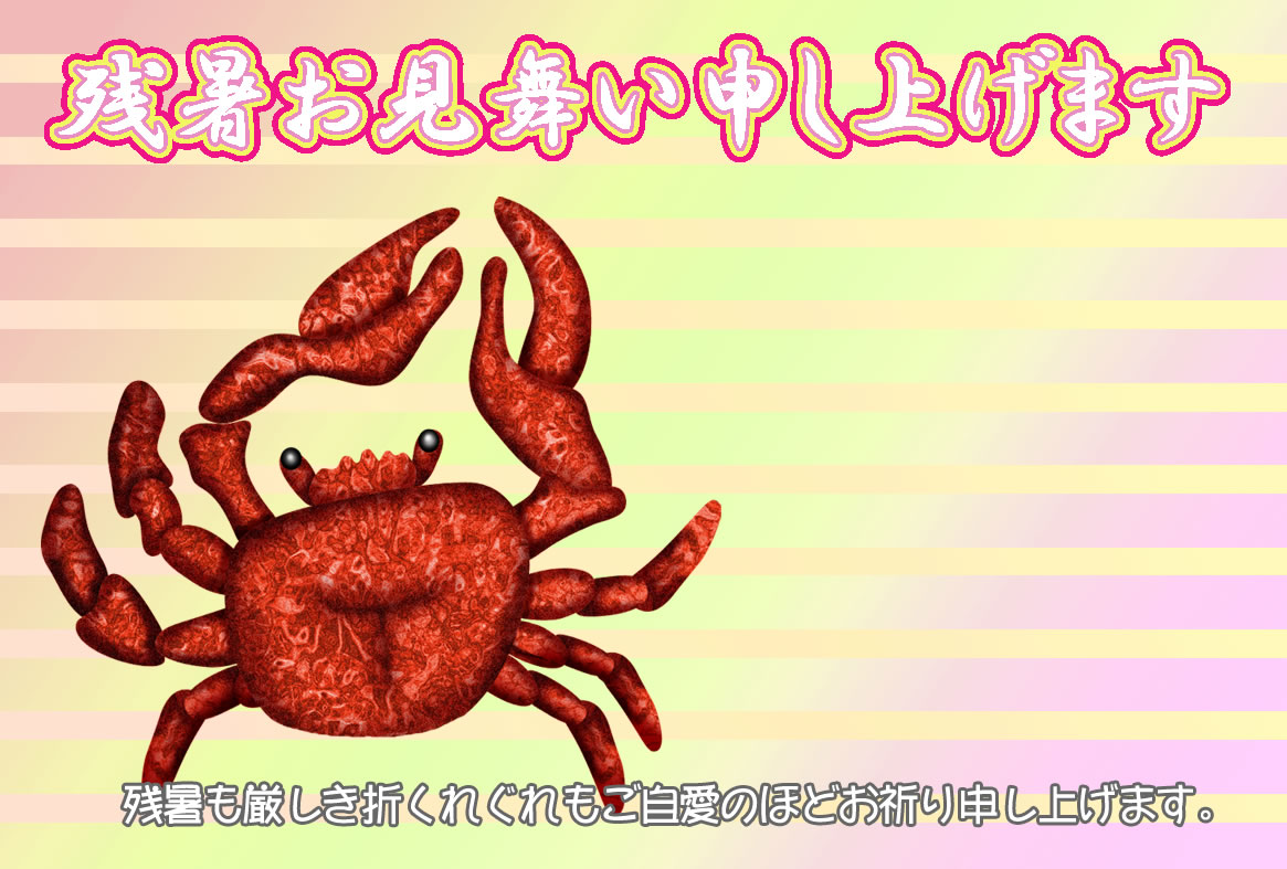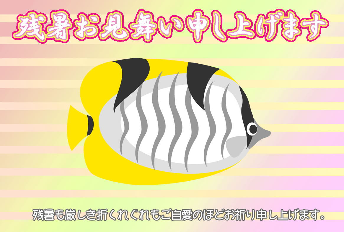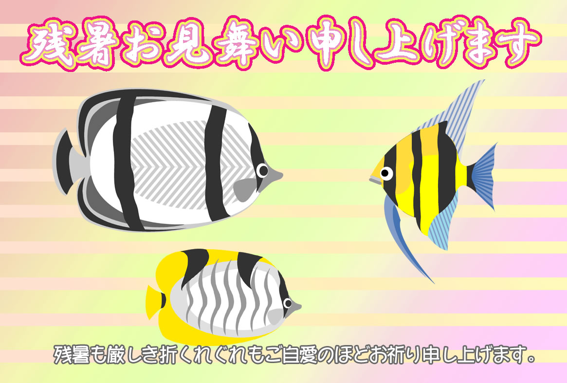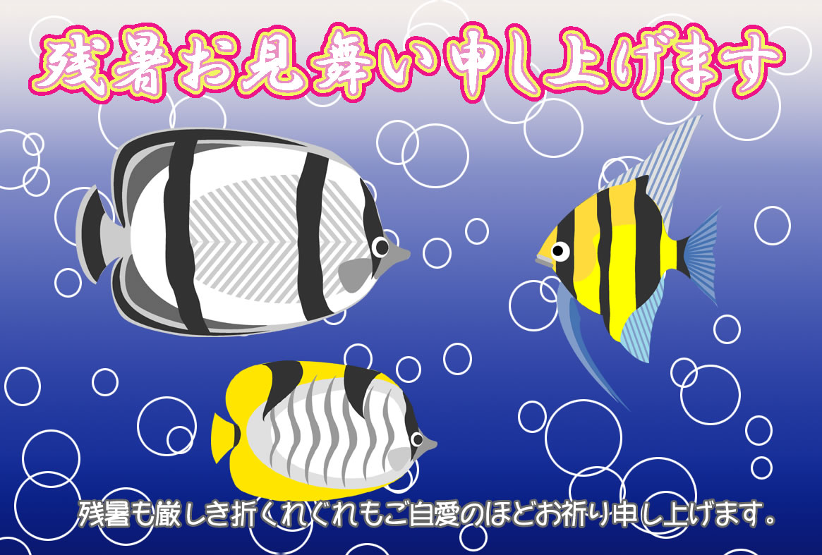 熱帯魚やカニ、クラゲや金魚などのイラストをあしらった残暑見舞いハガキの横書きデザインを無料提供しています。印刷するだけで残暑見舞いが完成する素材です。