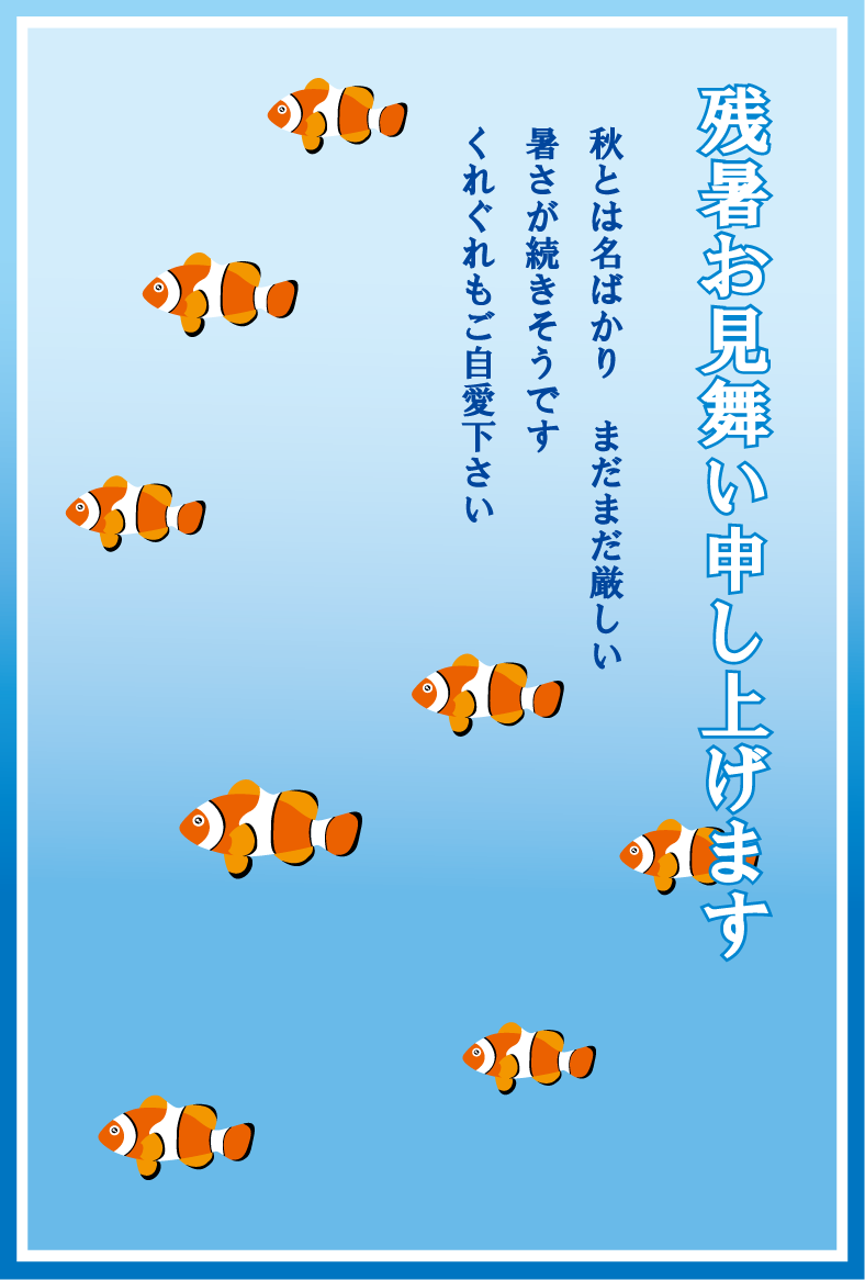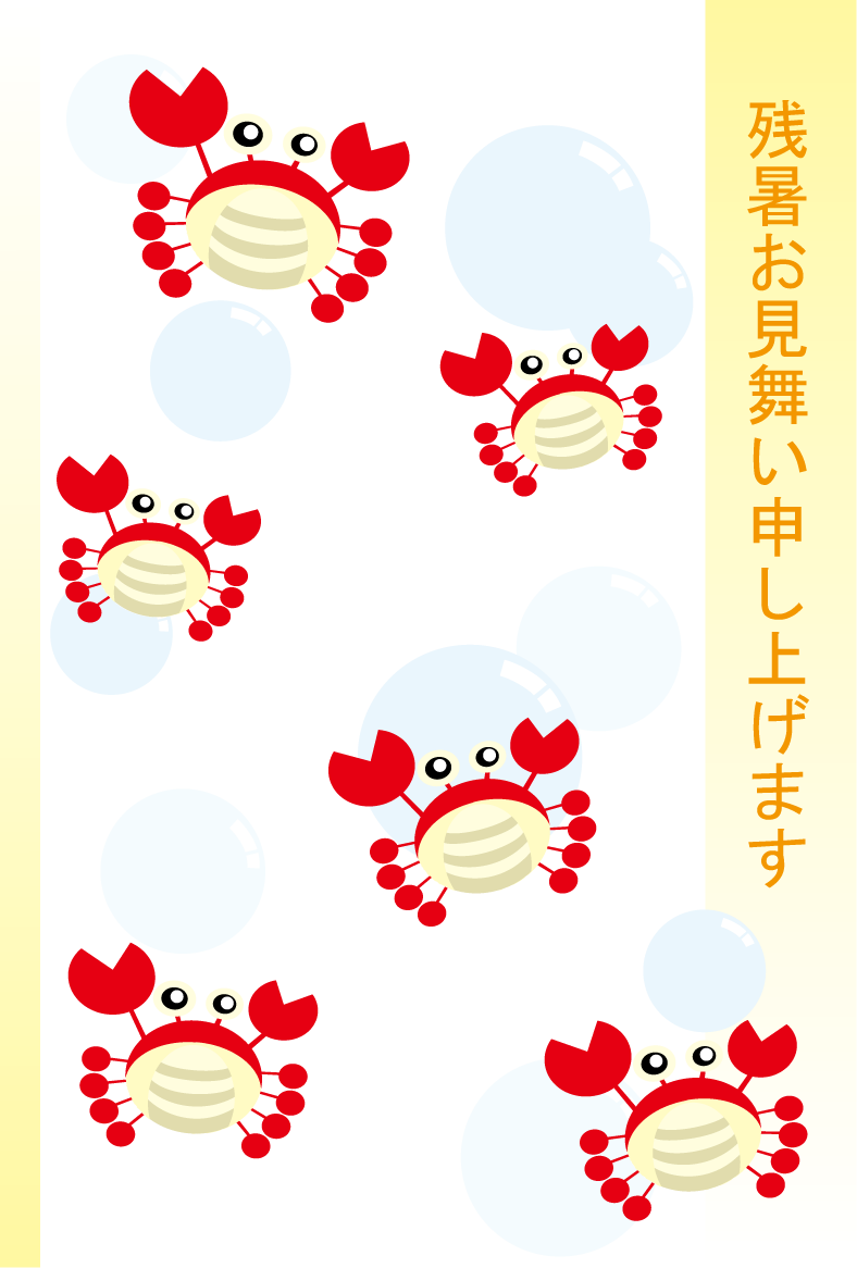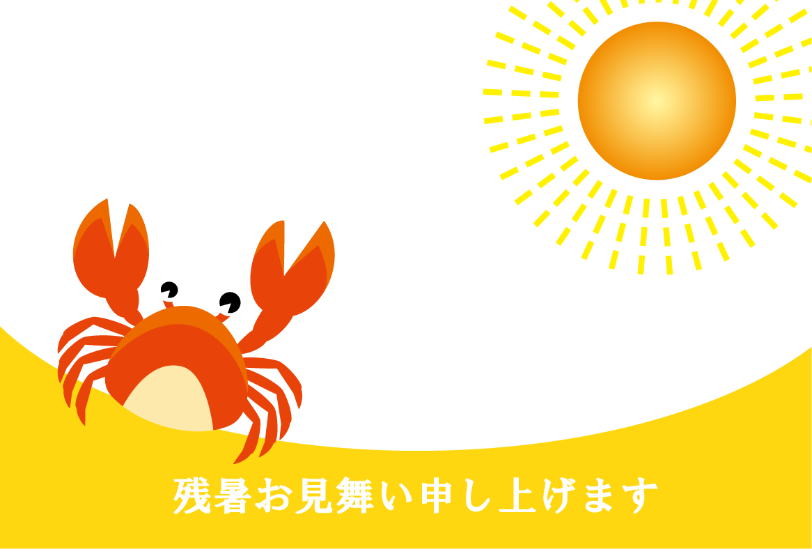 ビールやスイカ、カニやクマノミ、貝やイルカなどの夏らしいイラストをあしらった残暑見舞いハガキのデザインを無料提供しています。あいさつ文などを入れて印刷するだけで残暑見舞いが完成する素材です。