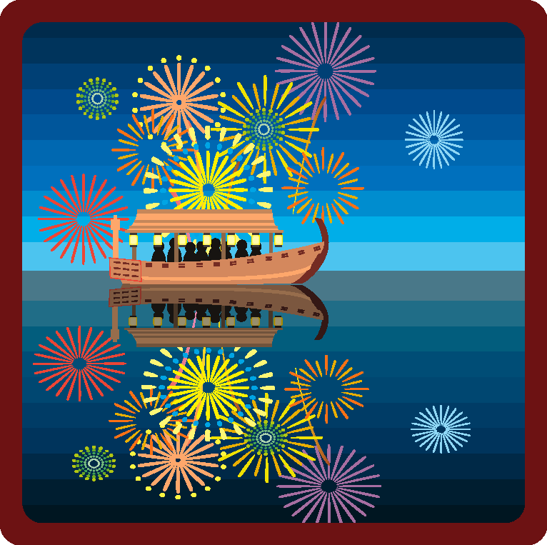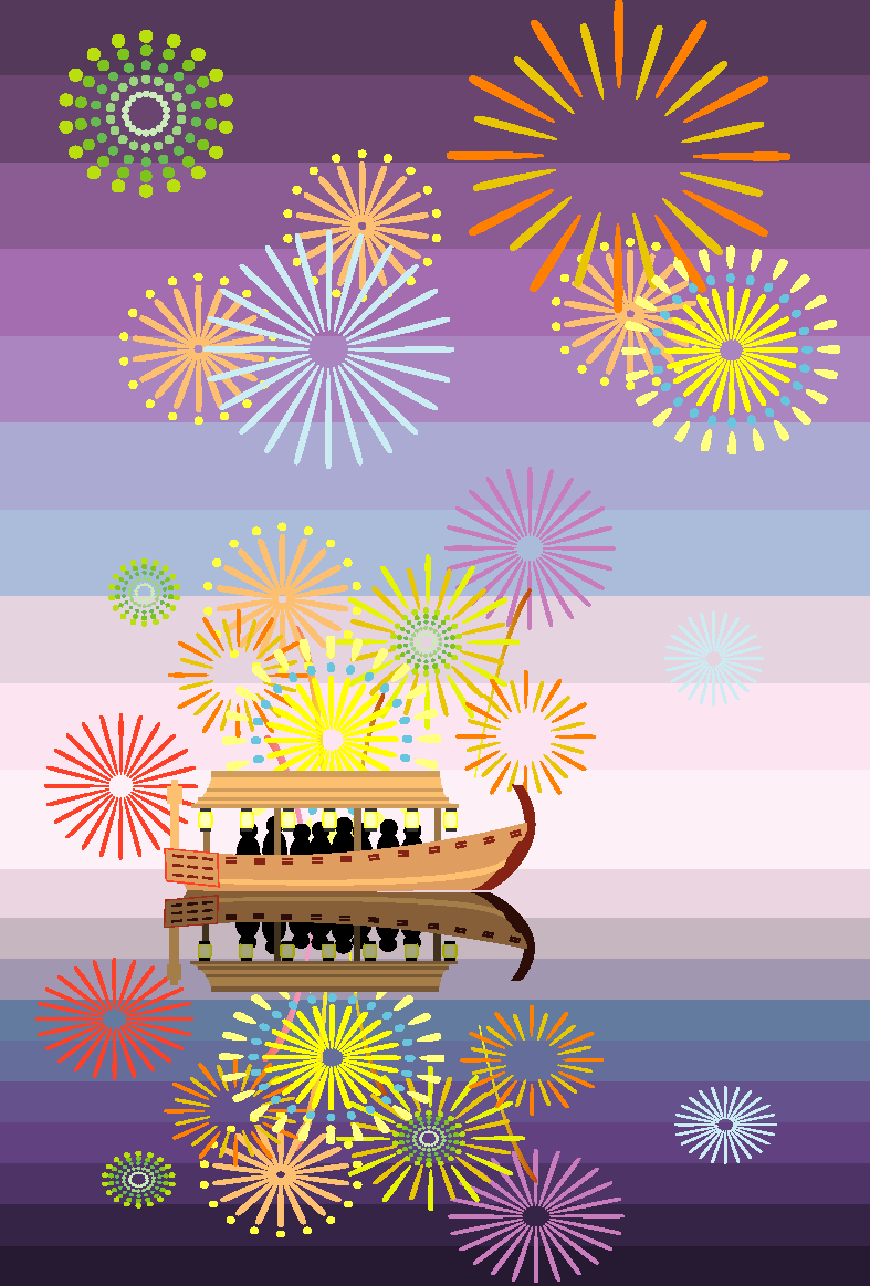 暑中見舞いや残暑見舞いに使える花火や花火大会、屋形船などのイラストを掲載しています。